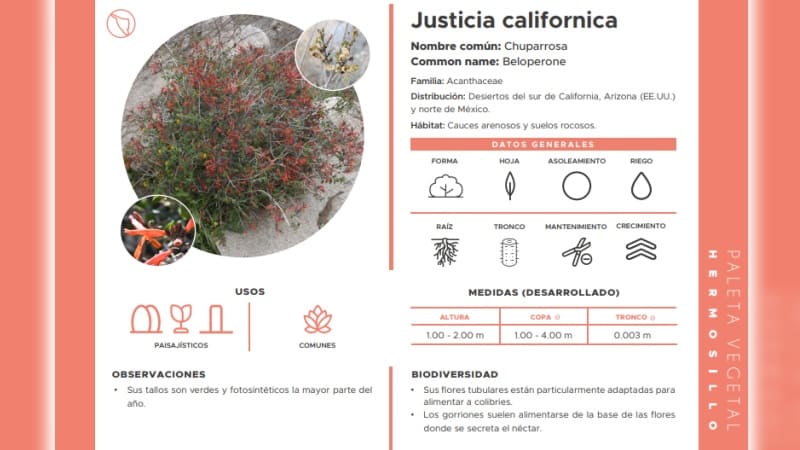 La paleta vegetal es un catálogo en donde se presentan especies nativas del estado de Sonora, a través de fichas técnicas que describen a detalle características de las especies, con fines educativos y normativos en el uso y selección de las especies permitidas en el espacio público y desarrollos inmobiliarios.