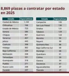 Zoé Robledo precisó que serán un total de 8,869 vacantes para médicos especialistas que se pongan a disposición en todo el país, donde Sonora ocupa el cuarto lugar en estados que tendrá más lugares disponibles, esto, después de estados como Ciudad de México, Chihuahua y Estado de México.