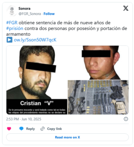 Hermosillo, Sonora.- La Fiscalía General de la República (FGR) en Sonora informó este martes que durante un procedimiento abreviado, fue dictada una sentencia de 9 años y 4 meses de prisión en contra de dos hombres tras ser encontrados responsables de los delitos de portación de armas de fuego y posesión de cargadores para arma de fuego de uso exclusivo de las Fuerzas Armadas. Se trata de Cristian V. y Pedro G.