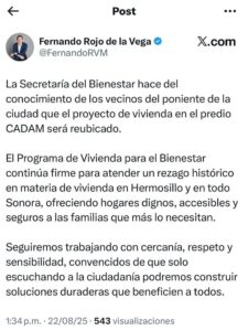 “La Secretaría del Bienestar hace del conocimiento de los vecinos del poniente de la ciudad que el proyecto de vivienda en el predio CADAM será reubicado. El Programa de Vivienda para el Bienestar continúa firme para atender un rezago histórico en materia de vivienda en Hermosillo y en todo Sonora, ofreciendo hogares dignos, accesibles y seguros a las familias que más lo necesitan. Seguiremos trabajando con cercanía, respeto y sensibilidad, convencidos de que solo escuchando a la ciudadanía podremos construir soluciones duraderas que beneficien a todos”, señaló en su cuenta de X, antes Twitter, el funcionario federal.
