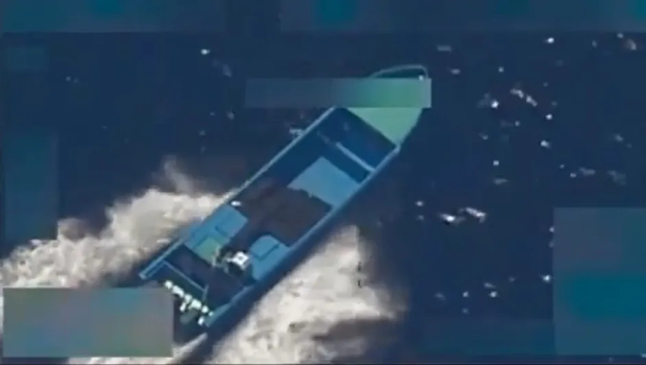 En un breve video publicado por Hegseth, se ve un pequeño bote, medio lleno de paquetes marrones, moviéndose por el agua. Varios segundos después, el bote explota y se ve flotando inmóvil en el agua en llamas.