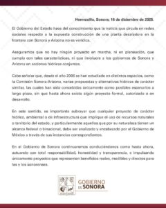 En un comunicado, el Gobierno Sonora aseguró que “no hay ningún proyecto en marcha, ni en planeación” o que “involucre a los gobiernos de Sonora y Arizona en acciones hídricas conjuntas”.