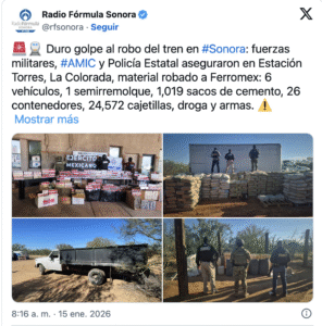 Los hechos ocurrieron el 14 de enero de 2026, donde las autoridades aseguraron material presuntamente robado al tren de la empresa Ferromex, así como armas y droga.