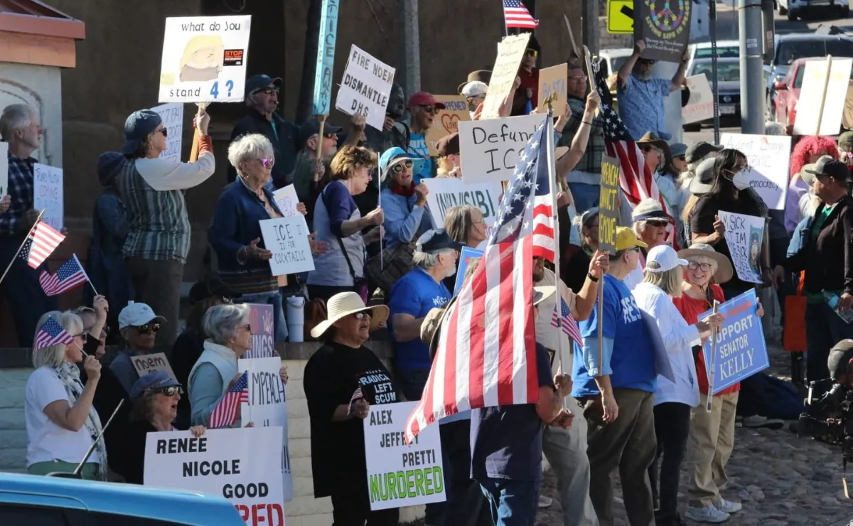 Cerca de un centenar de vecinos de Nogales, Arizona se manifestaron contra la presencia de Kristi Noem, y mostraron sus pancartas y consignas contra el Servicio de Inmigración y Control de Aduanas de Estados Unidos (U.S. Immigration and Customs Enforcement).